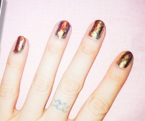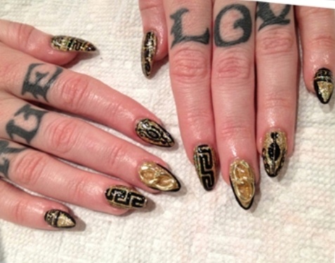 | Họa tiết đen là điểm nhấn nổi bật cho nail màu đồng. Bạn gái nên diện váy áo cùng tông để tôn nước da và thêm phần tỏa sáng. |