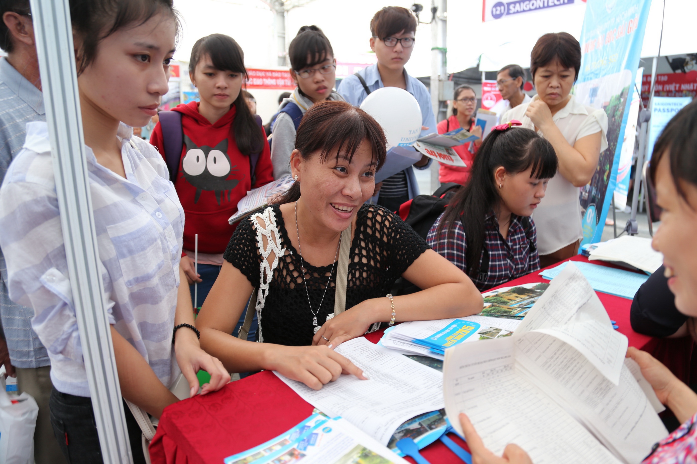 Phụ huynh và thí sinh sau khi nghe tư vấn xét tuyển đã nộp hồ sơ đăng ký xét tuyển trực tiếp tại gian tư vấn ở Ngày hội tư vấn xét tuyển 2015 do báo Tuổi Trẻ và Bộ GD&ĐT phối hợp tổ chức. Ảnh: Tuổi Trẻ. |