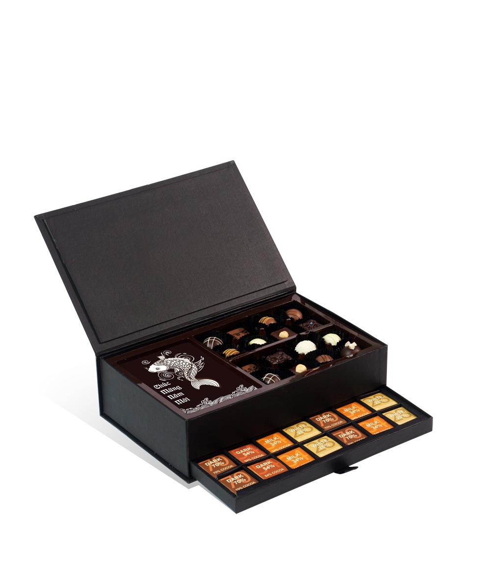 Hộp 2 tầng gồm socola nghệ thuật, socola tươi với nhiều loại nhân khác nhau và viên socola với hương vị đậm đà cho bạn thỏa sức thưởng thức.