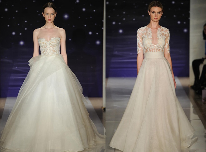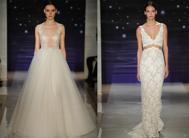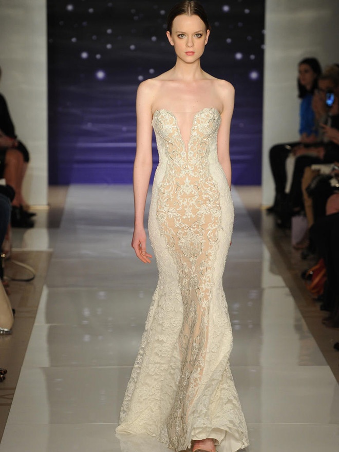 | Kết hợp cổ chữ V, chữ U và các loại vải xuyên thấu mỏng tang như sheer, thêm hoa văn trang trí bằng đá quý, những chiếc váy cưới mới nhất của Reem Acra đủ sức chinh phục bất kỳ cô dâu khó tính nào. |