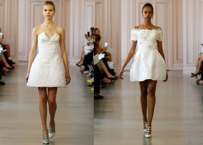 | Ngoài ra, Oscar De La Renta còn có các thiết kế váy cưới ngắn, để cô dâu tinh nghịch tha hồ vui chơi cùng bạn bè giữa nắng vàng, cát trắng và biển xanh. |