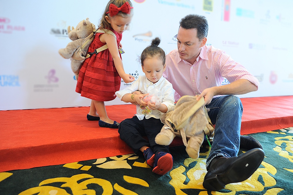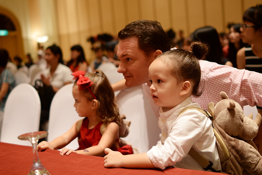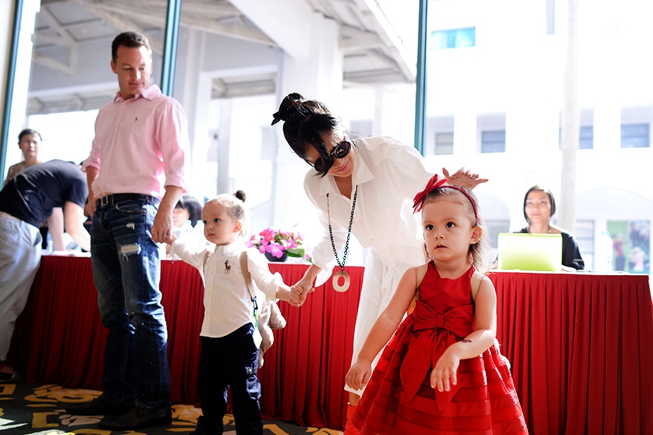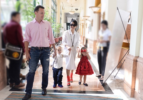 | Ông xã của Hồng Nhung - Kevin - quấn quít bên hai con trong lúc vợ đang tham gia họp báo. Hiện tại, đối với cô Bống là những tháng ngày viên mãn bên người chồng ngoại quốc và cặp đôi song sinh một trai, một gái. Ở bên nhau hơn 7 năm nhưng tình yêu của cặp đôi vẫn rất mặn nồng và gần như không có chuyện cãi vã. |