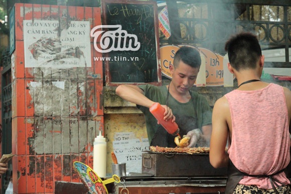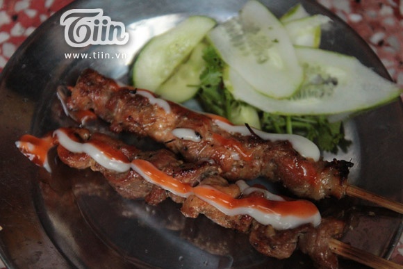 | Chủ quán thịt xiên đang đứng phục vụ thực khách. |