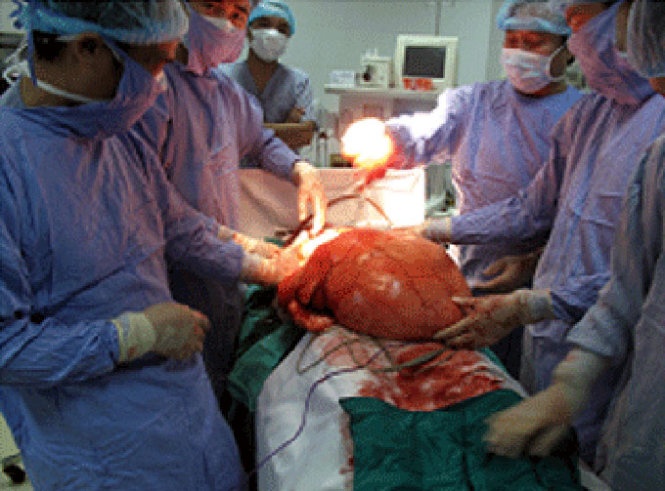 Khối u khủng hơn thuộc về ông Đinh Trọng D. (70 tuổi, Hải Dương): nặng 15kg. Ông D. mang trong mình khối u bụng trên 10 năm, đến khi bị căng tức nặng toàn ổ bụng, gầy yếu, đi lại rất khó khăn ông mới đến bệnh viện trung ương Quân đội 108 để mổ.