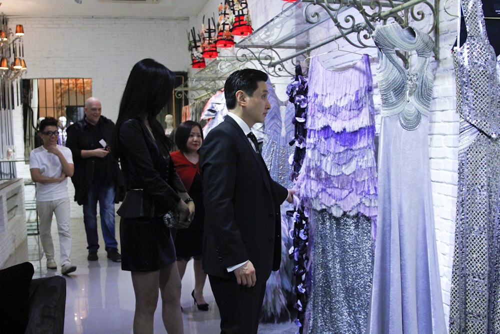 Ông Frank Cintamani quan sát rất kỹ những mẫu váy được bày tại showroom của giám khảo Project Runway Vietnam 2014.