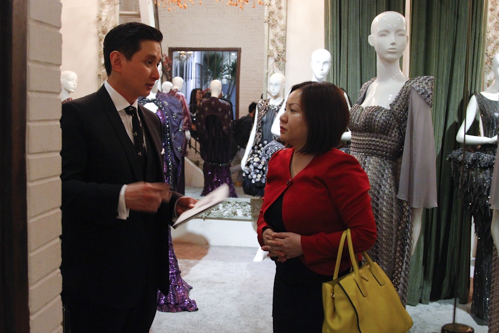 Ông Frank Cintamani rất ấn tượng và dành nhiều thời gian để nhìn ngắm từng mẫu thiết kế được trưng bày tại showroom của giám khảo ''Project Runway Vietnam 2014''.