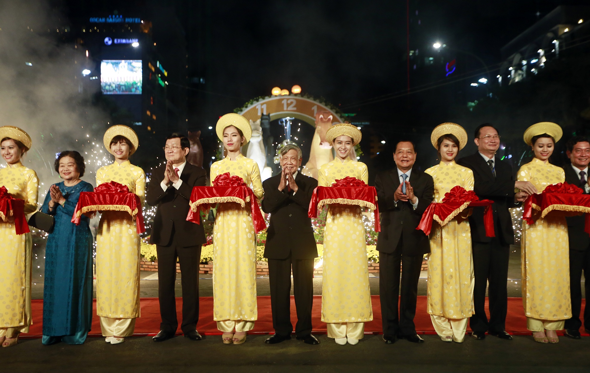 | Các vị lãnh đạo Đảng và Nhà nước cắt băng khai mạc đường hoa Nguyễn Huệ xuân Giáp Ngọ 2014. Trước đó, Chủ tịch nước Trương Tấn Sang cùng các đại biểu đã dâng hoa tại tượng đài Bác Hồ trước UBND Thành phố Hồ Chí Minh. |