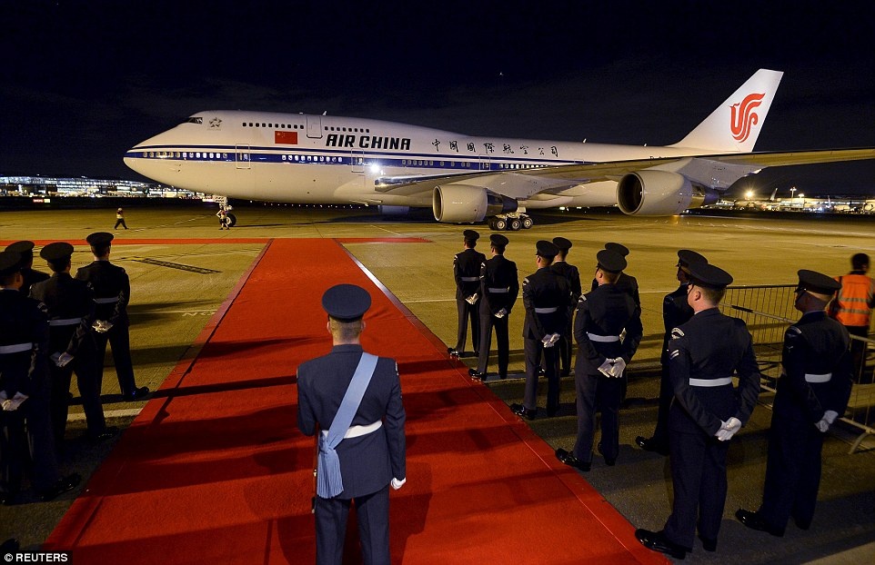 | Phi cơ của hãng Air China chở phái đoàn Trung Quốc do Chủ tịch Tập Cận Bình dẫn đầu hạ cánh sân bay Heathrow ở London. Ảnh: Reuters |