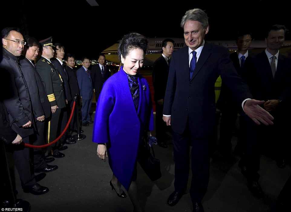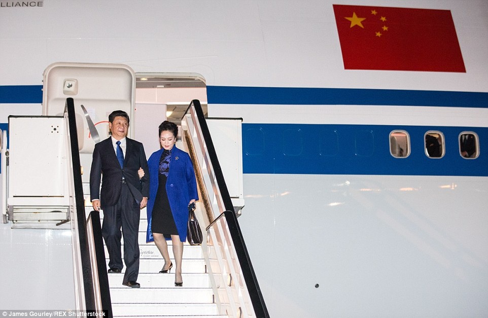 | Ông Tập Cận Bình và phu nhân Bành Lệ Viện rời máy bay, bắt đầu chuyến thăm Anh trong 4 ngày. Thủ tướng Anh David Cameron hoan nghênh chuyến thăm diễn ra vào "giai đoạn vàng" trong quan hệ Anh - Trung Quốc. Ảnh: REX |