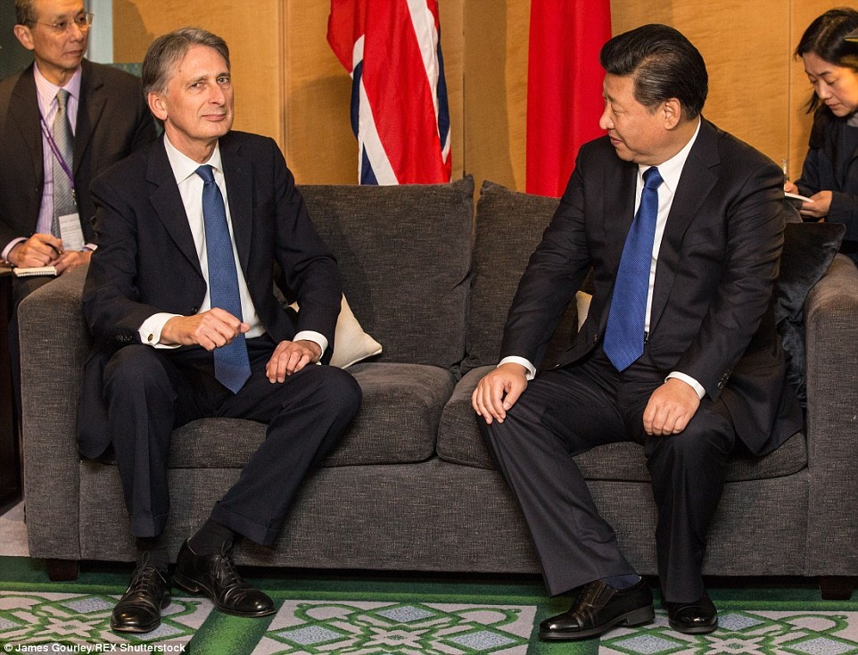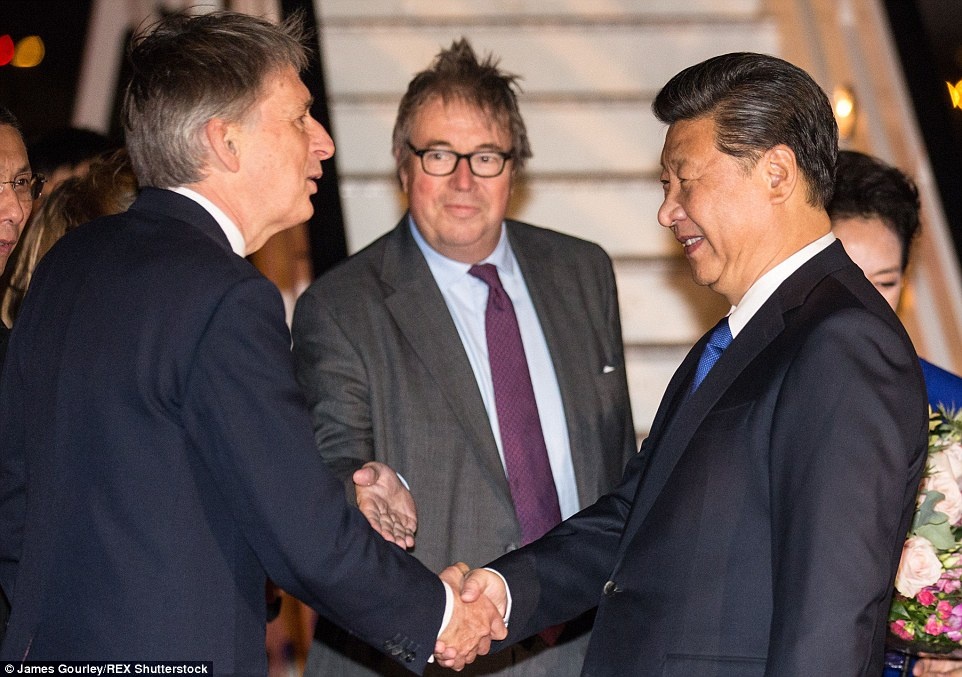 | Ngoại trưởng Anh Philip Hammond đón ông Tập Cận Bình tại sân bay. Văn phòng Thủ tướng Anh cho biết, các tập đoàn hai nước sẽ ký kết hợp tác ở nhiều lĩnh vực, bao gồm bán lẻ, năng lượng, tài chính và hàng không, dự kiến mang lại 3.900 việc làm ở Anh. Ảnh: REX |