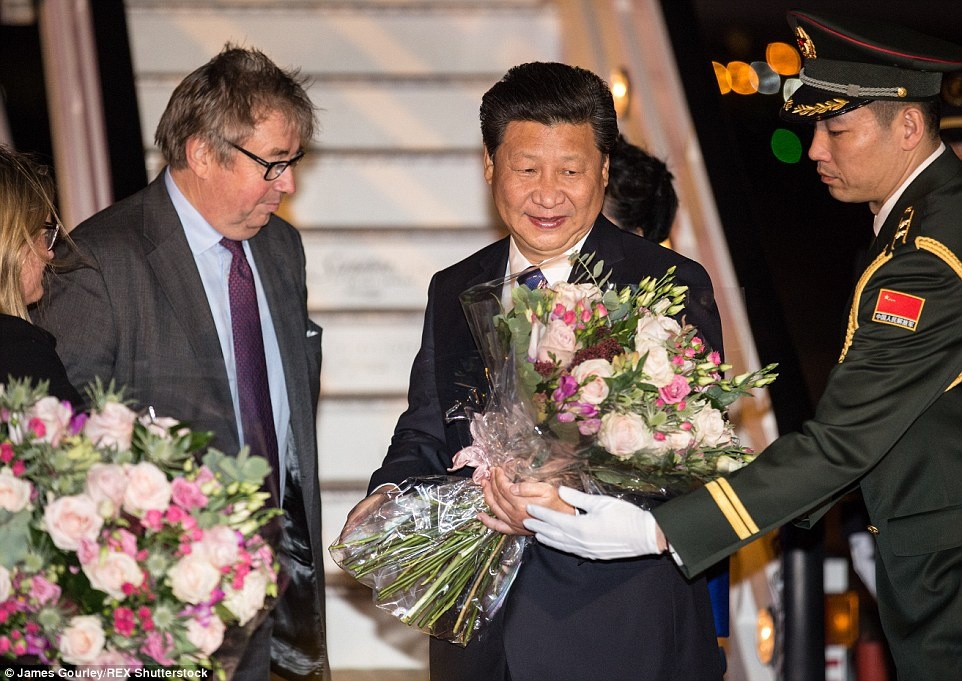 | Chủ tịch Trung Quốc được tặng hoa khi vừa đáp tại phi trường ở thủ đô London. "Đây là thời điểm rất quan trọng đối với quan hệ Anh - Trung Quốc. Thương mại và đầu tư giữa hai nước ngày càng tăng, các mối liên kết nhân dân ngày càng vững mạnh", Thủ tướng Anh phát biểu trước thời điểm chuyến thăm của ông Tập Cận Bình. Ảnh: REX |