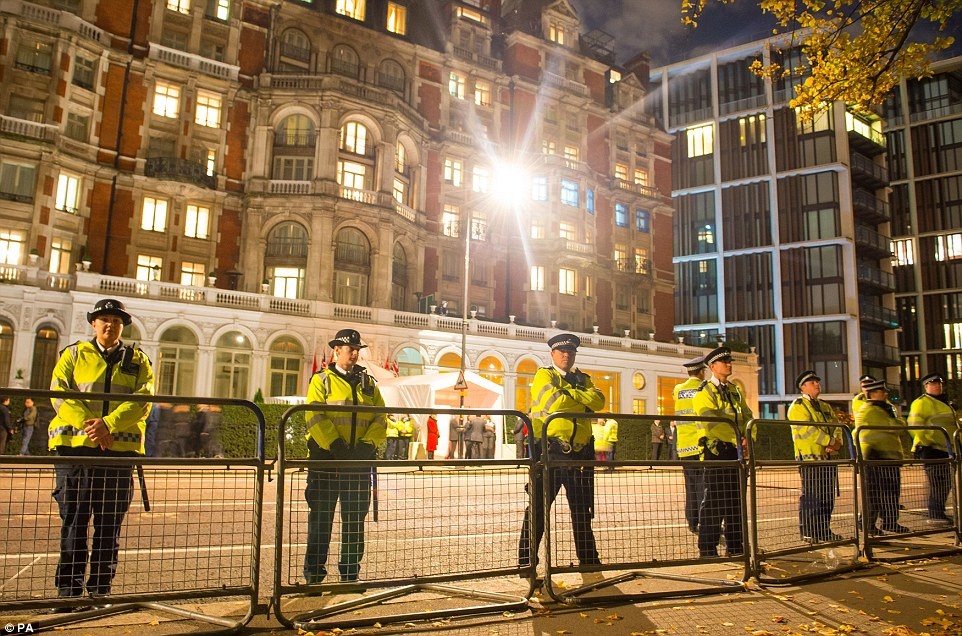 | Cảnh sát canh gác nghiêm ngặt xung quanh khách sạn Mandarin Oriental là nơi đoàn Trung Quốc lưu lại trong thời gian ở Anh. Ảnh: PA |
