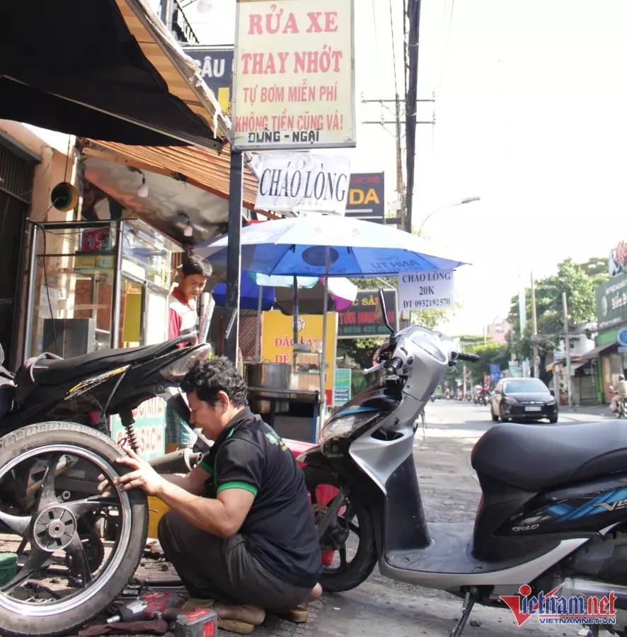 Họ đẩy xe đi tới lui trên đường Âu Cơ mấy bận. Chợt thấy chữ “Không tiền cũng vá. Đừng ngại” của tiệm sửa xe Vinh, hai vợ chồng bấm bụng đẩy xe vào nhờ giúp đỡ.
