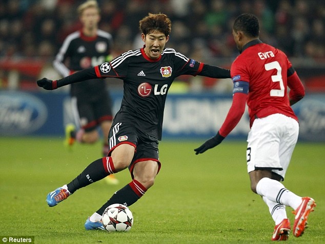 | Son Heung-Min cố gắng vượt qua sự truy cản của hậu vệ trái Evra. |