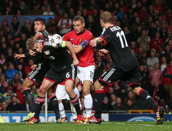 | Thủ quân Vidic vất vả trước tiền đạo cao lớn bên phía Leverkusen. |