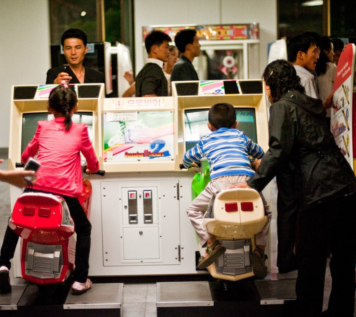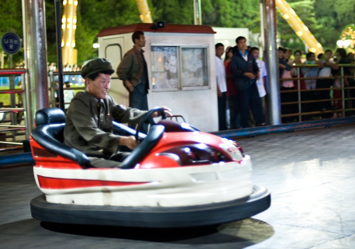 | Một người lính Triều Tiên chơi trò lái xe điện tại khu giải trí. |