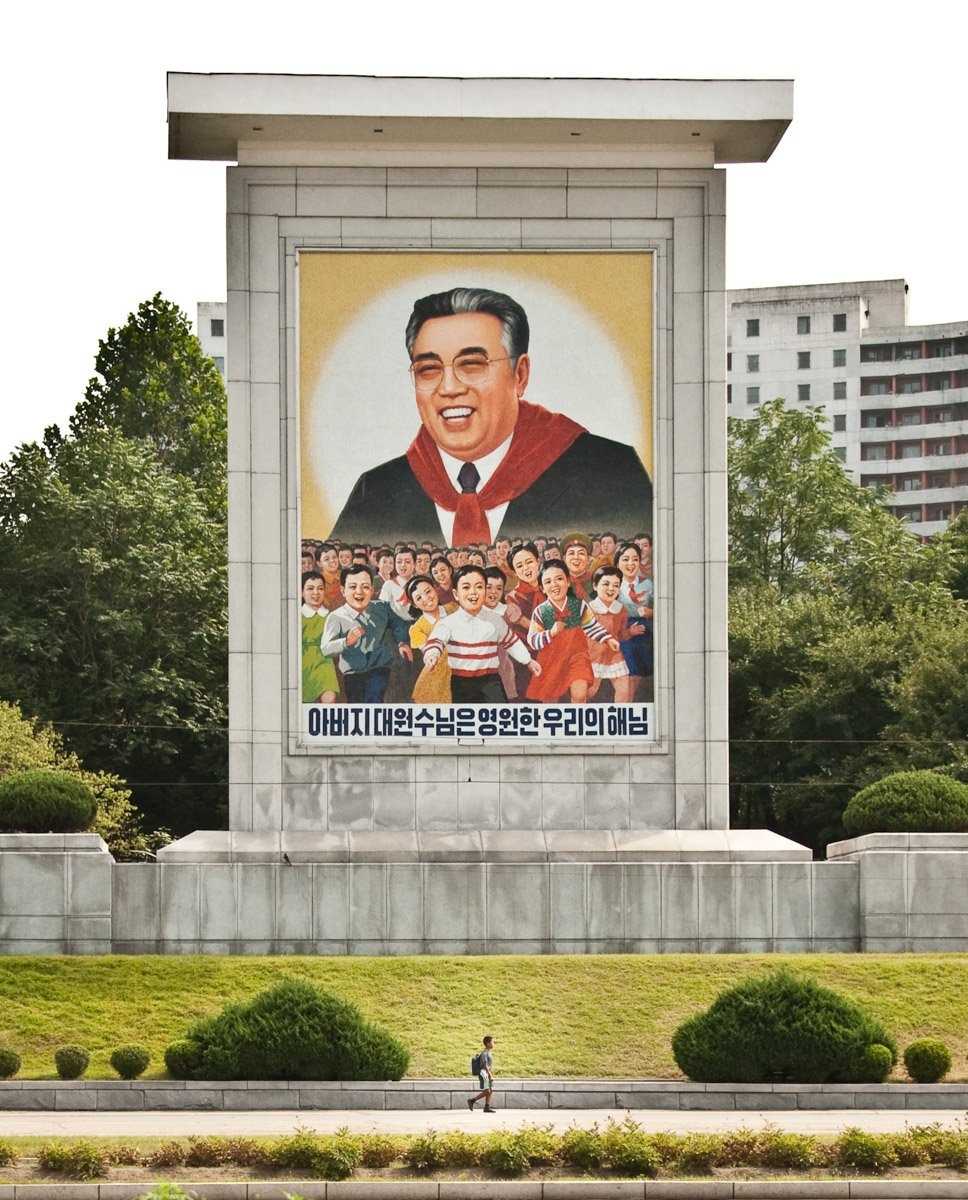 | Một em nhỏ đi qua quảng trường đặt bức tranh cổ động lớn về cố chủ tịch Kim Nhật Thành, người sáng lập đất nước. |