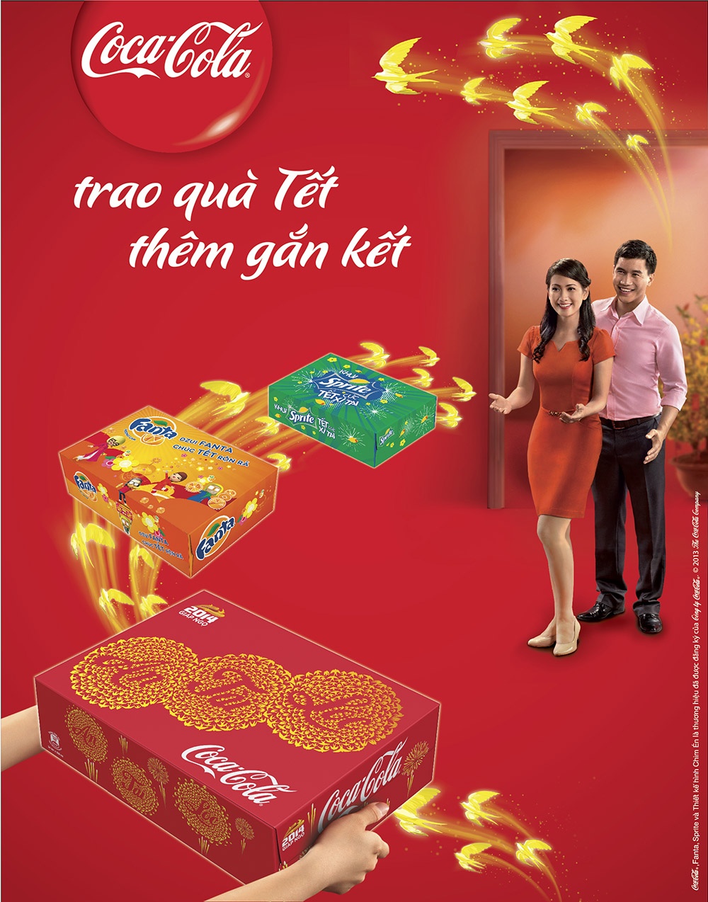 Quà Tết ắt hẳn không thể thiếu Coca-Cola. Những cánh én vàng tiếp tục mang đến lời chúc xuân An - Tài - Lộc giàu ý nghĩa: chúc bình an cho ông bà cha mẹ, luôn luôn mạnh khỏe, chúc tấn tài cho người kinh doanh, làm quà cho đồng nghiệp đối tác, chúc tấn lộc cho người thân, trao may mắn quanh năm. Trao Coca-Cola chính là cách đơn giản nhất để trao nhau lời chúc an - tài - lộc đầu xuân đầy ý nghĩa. Bên cạnh đó, với sắc đỏ chủ đạo, Coca-Cola tiếp tục dẫn đầu với thiết kế bao bì tinh giản, hiện đại, xứng đáng là chọn lựa lý tưởng mà ai cũng muốn trao nhận trong dịp xuân về.