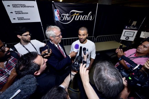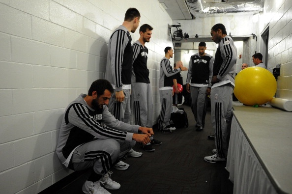 | Các ngôi sao của Spurs chuyện trò khá vui vẻ. Chiến thắng ấn tượng ở Game 3 cách đây 1 ngày giúp đội khách tạm vượt lên dẫn 2-1 ở loạt trận chung kết NBA 2014. |
