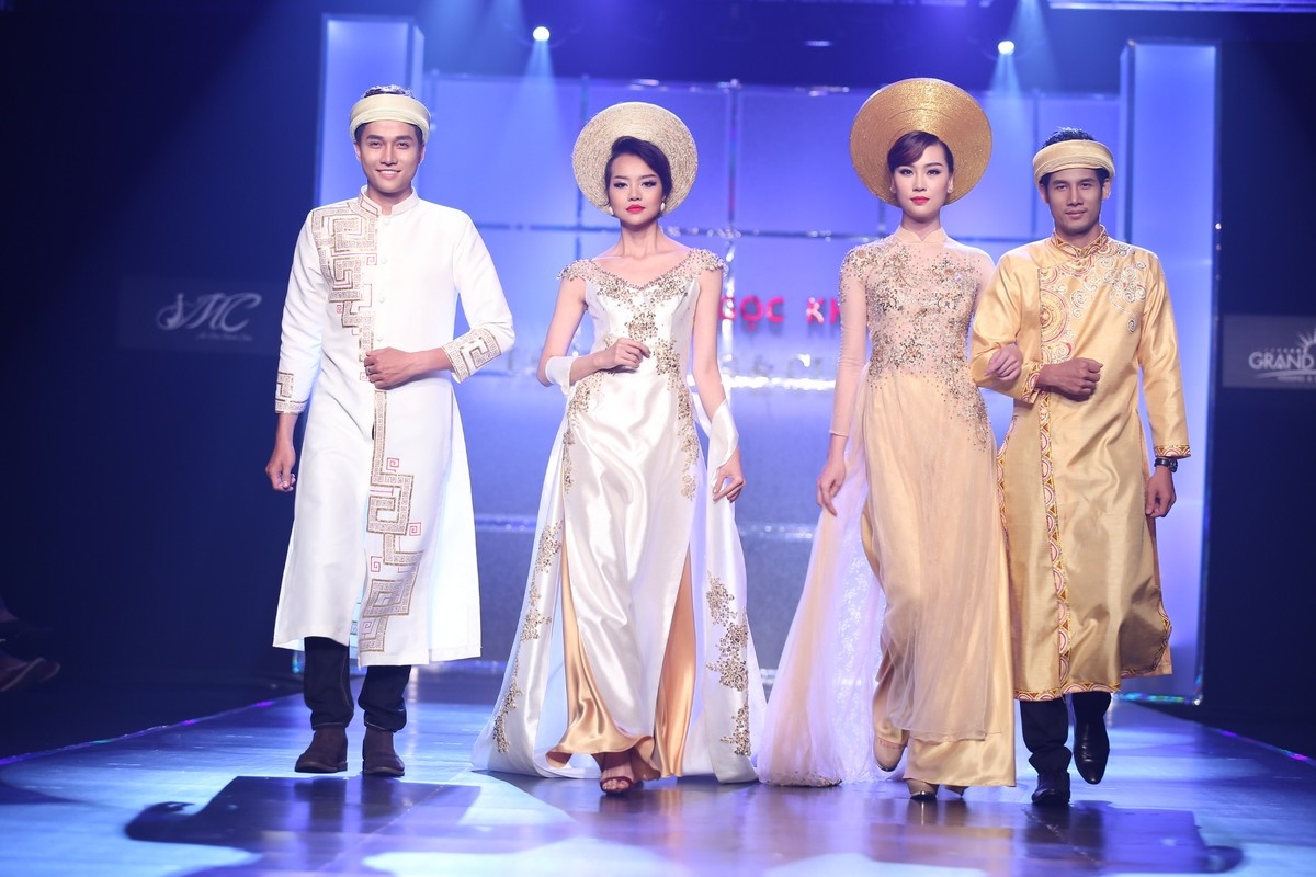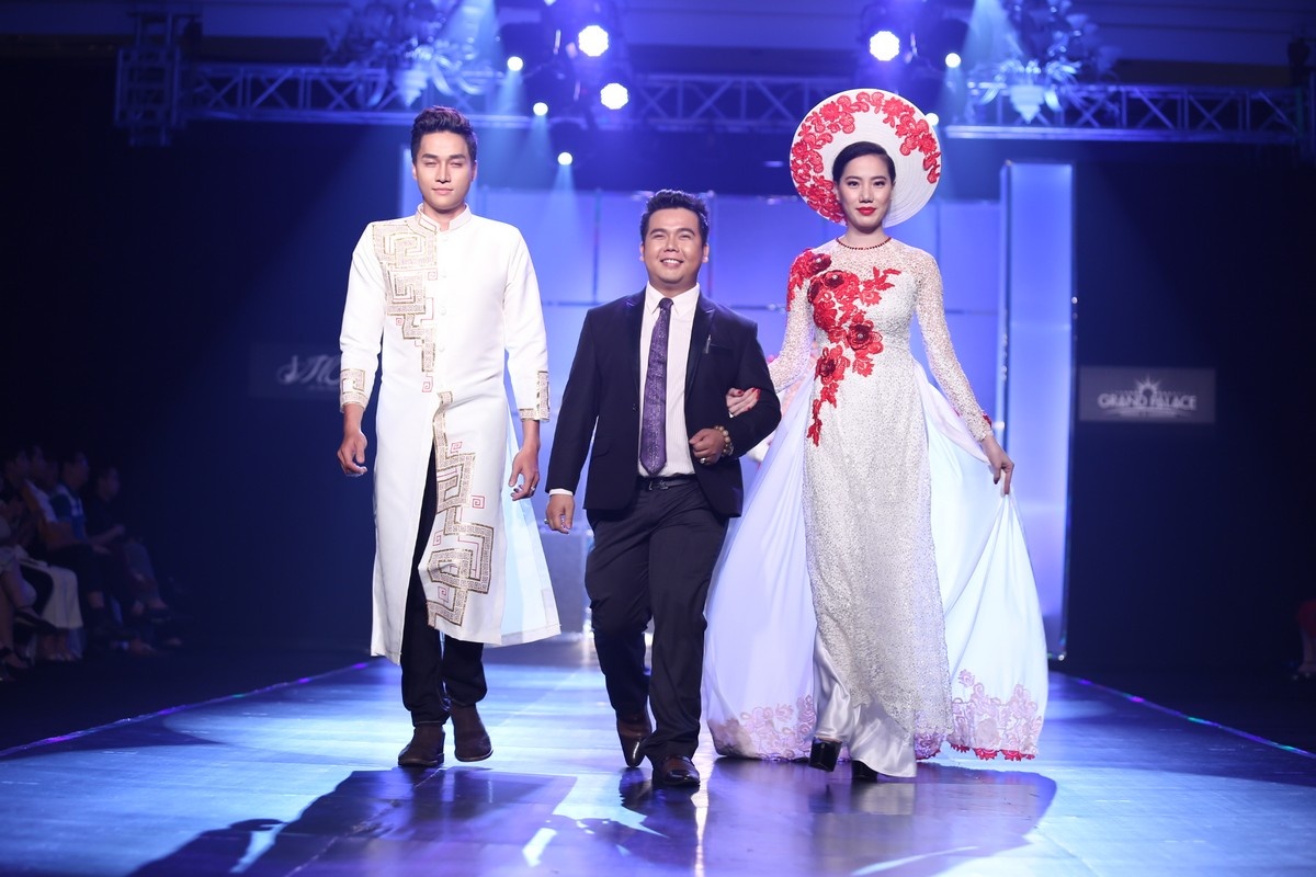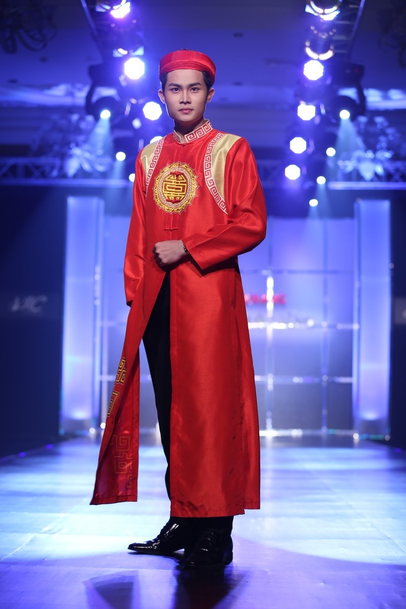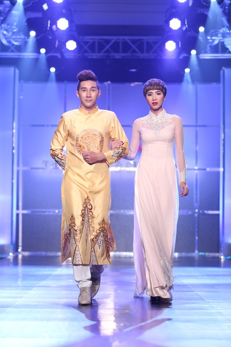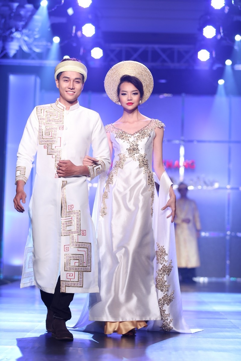 Huỳnh Nu thướt tha trong mẫu áo dài nữ đính hạt tinh tế. Áo dài nam được đặc tả phần họa tiết truyền thống.