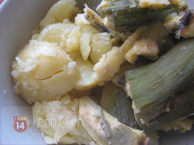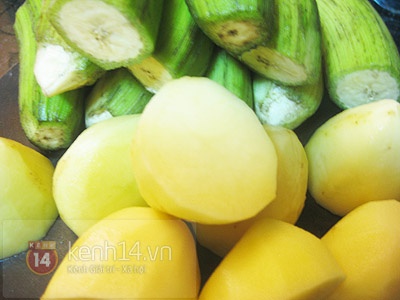 - Cắt khúc chuối và khoai tây rồi đem luộc qua.