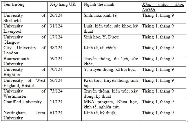 Nhiều trường trong số đó thuộc nhóm top 20 trường hàng đầu tại Anh Quốc như The University of Liverpool, The University of Sheffield, The University of Glasgow, City University London.