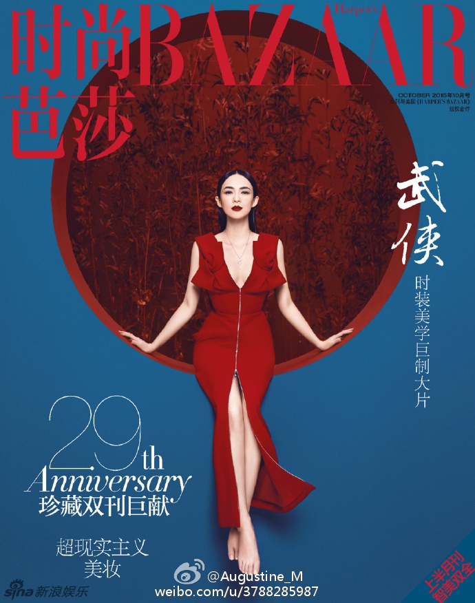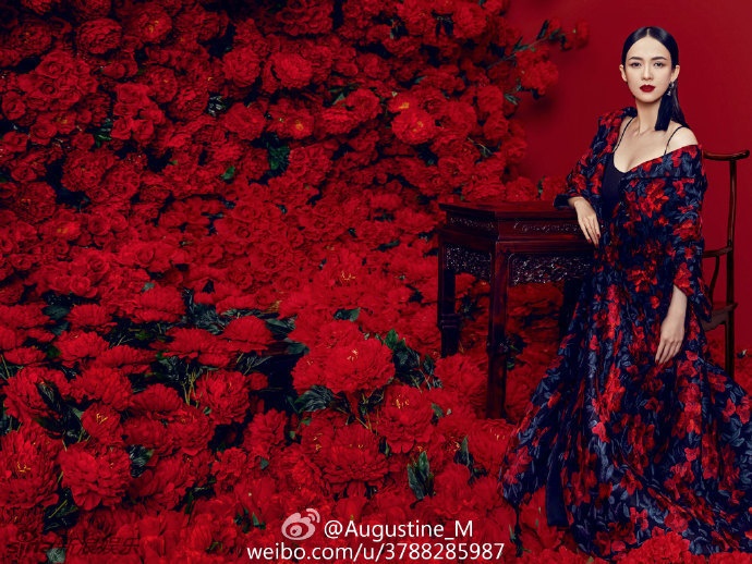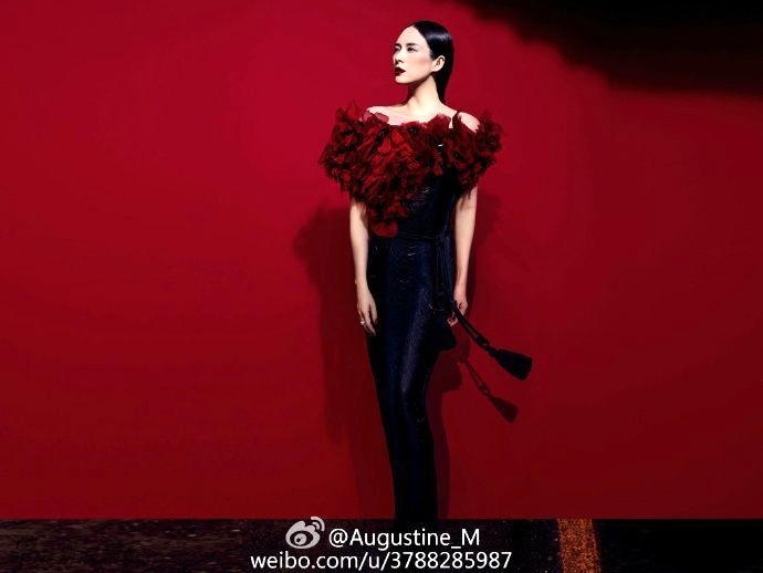 | Chương Tử Di nổi bật trong bộ ảnh thực hiện cho Harper's Bazaar với sắc đỏ quyến rũ. |