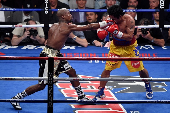 | Mayweather luôn giữ khoảng cách và tận dụng sải tay dài để tấn công Pacman. Ảnh: Getty Images. |