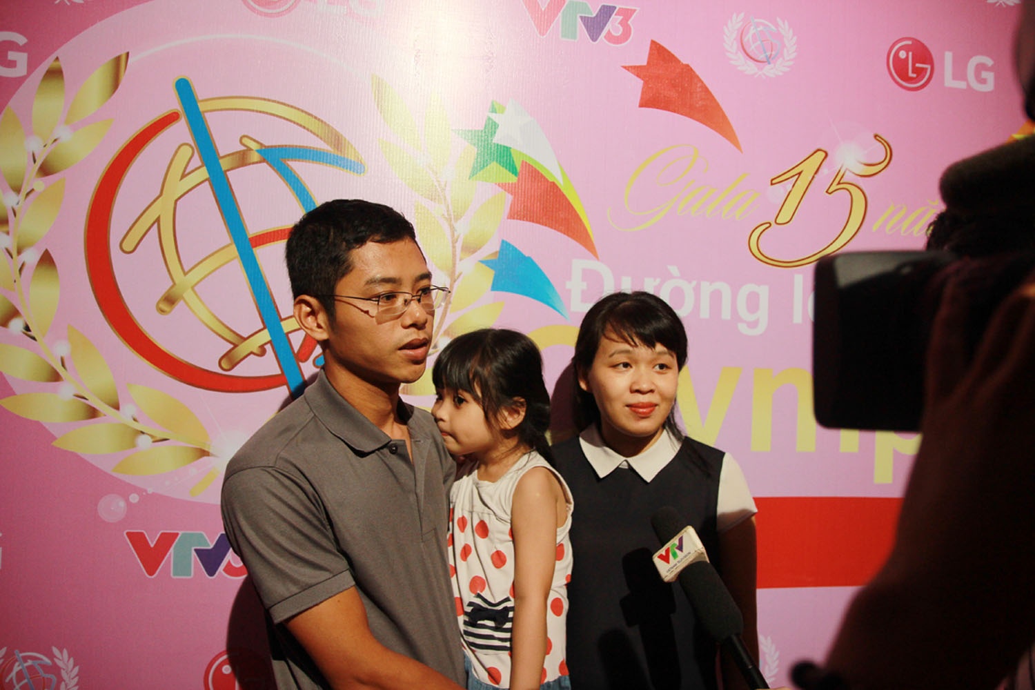 | Đêm gala là sự lan tỏa của cộng đồng Olympia trong suốt 15 năm qua: Bí mật về những thứ đầu tiên như hình hiệu, đồ họa, câu hỏi, vòng nguyệt quế; những cặp đôi trở thành anh em, vợ chồng; những cuộc thi lấy cảm hứng từ Olympia và những hoạt động của cộng đồng trong và ngoài nước. Trong ảnh là cặp đôi Phạm Văn Thắng - Phương Quỳnh và con gái. Cả hai đã nên duyên vợ chồng và sống hạnh phúc từ "bà mai" Olympia. |