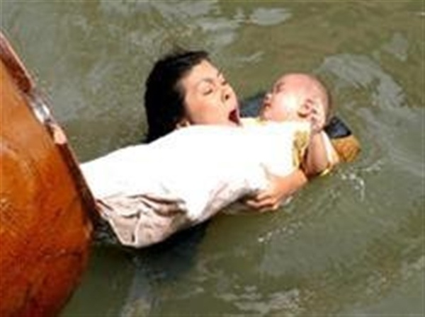 | Mai (Anh Thư) bế con trai từ trong chiếc lu nước trôi trên sông ra ngoài. |