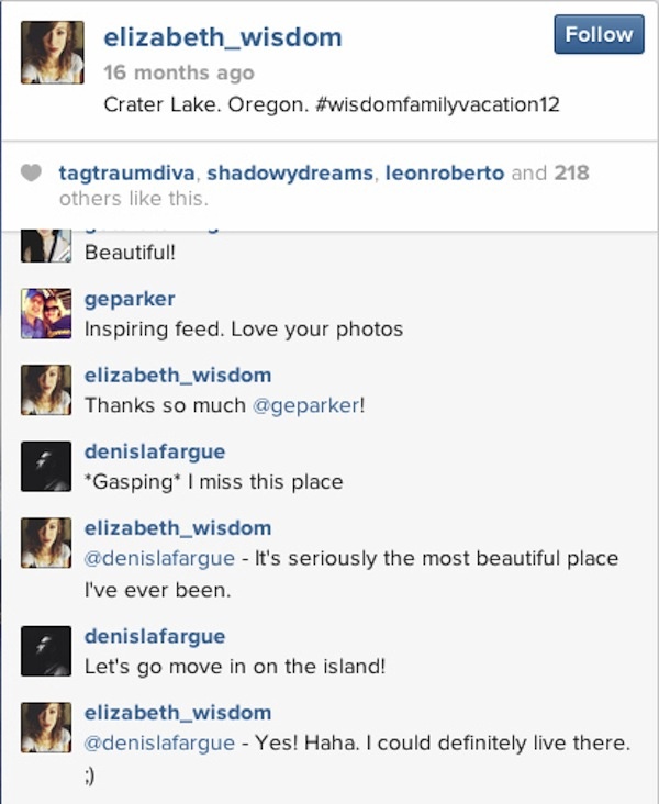| Từ năm 2012, cô nàng Elizabeth Wisdom đăng tải bức hình công viên quốc gia Oregon (Mỹ) lên Instagram. |
