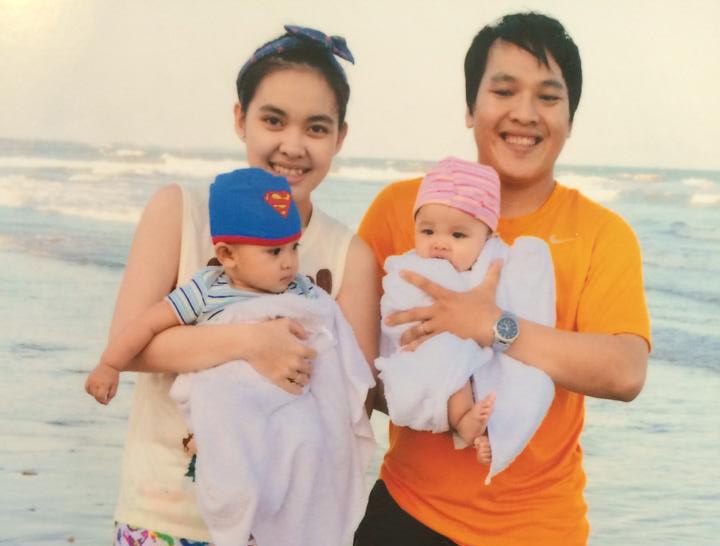 | Gia đình Tấn Hiếu - Phương Dung hạnh phúc với cặp sinh đôi trai gái Coca và Cola. |