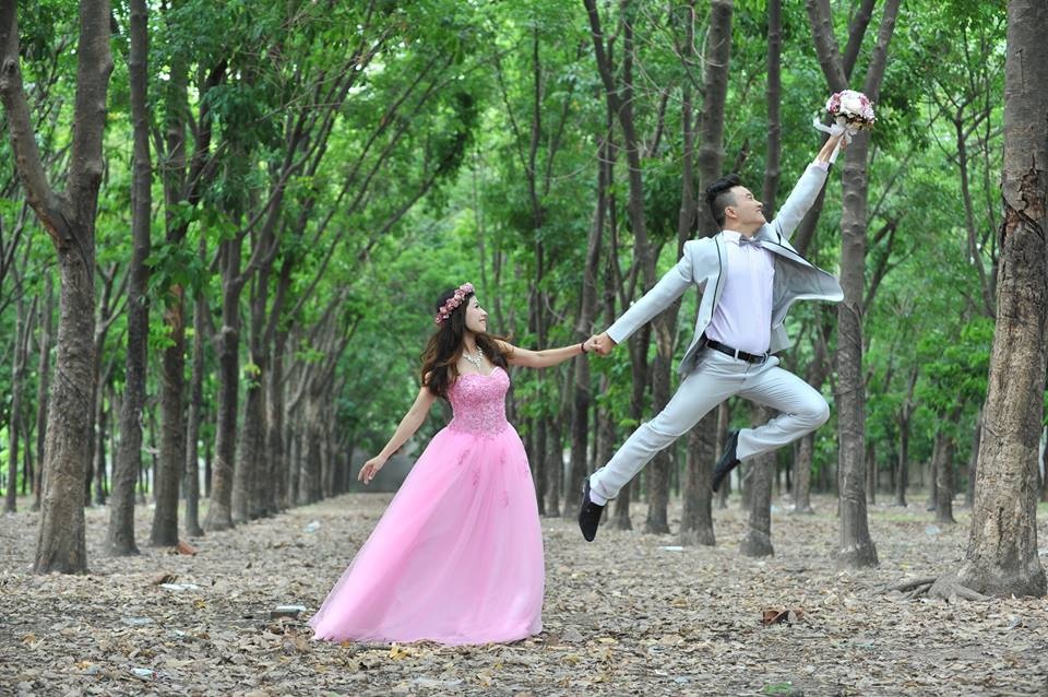 | Hữu Dân và Thùy Trang sinh hoạt trong vũ đoàn. Do đó, bộ ảnh cưới của cặp đôi được thực hiện theo ý tưởng "mỗi bức ảnh là một bước nhảy". |