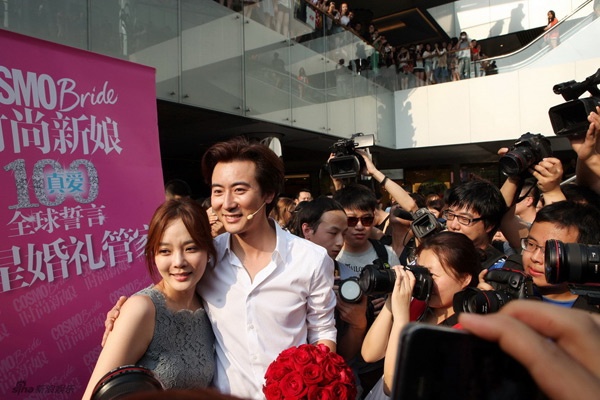 Mối duyên của mỹ nhân phim Sắc, giới với Kim Tae Yong bắt đầu khi nàng đóng vai nữ chính trong tác phẩm điện ảnh Thu muộn (2010) do chàng làm đạo diễn. Làm lễ đính hôn hôm 2/7, đến ngày 12/7, công ty quản lý của Thang Duy công bố họ chính thức trở thành vợ chồng bằng một lễ cưới tại Thụy Điển. Nàng sinh năm 1979, lần đầu lên xe hoa, chàng lớn hơn 10 tuổi, đã qua một lần đò.