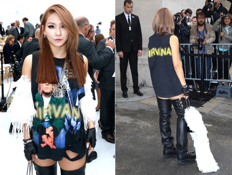 | Cô nàng trưởng nhóm 2NE1 cá tính với chiếc áo sát nách rách, bụi phủi in hình ban nhạc rock huyền thoại Nirvana và boot boot cao trên gối hầm hố. |