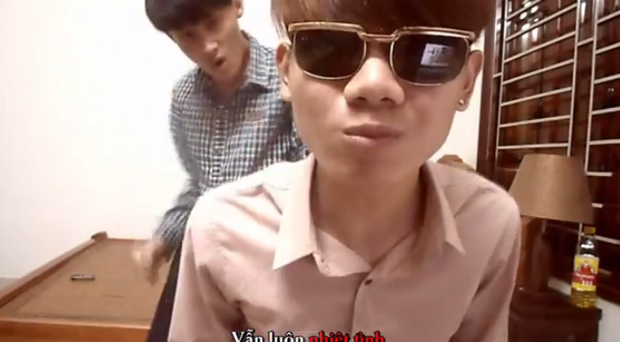 | Tạo hình hài hước của Nguyễn Đình Khu và Nguyễn Quốc Khánh trong clip chế Em của trường Kinh Công. (Ảnh cắt từ clip). |