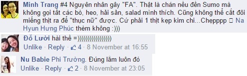 Nhiều bạn trẻ bày tỏ sự thích thú khi xem clip hài hước này. Một bạn hóm hỉnh chia sẻ trên mạng xã hội: “Nếu đến Sumo mà không gọi tất các bò, heo, hải sản, salad mình thích, bữa ăn sẽ không còn ngon và thú vị nữa. Đến đây ăn cũng không thể từ tốn để tỏ ra "thục nữ" được. Món ăn ngon qua nên mình phải thưởng thức hết mình, mỗi kép thịt là mỗi kẹp kim chi".