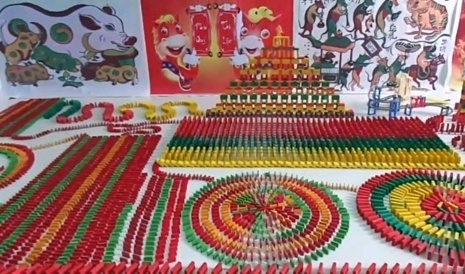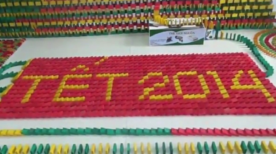 Trong clip, 21.400 quân domino được xếp thành hình ảnh lá cờ Việt Nam, Tết 2014 hay những bức tranh dân gian... Khi bức tranh về Tết hoàn thiện, hiệu ứng đẹp mắt hơn với từng quân domido lần lượt đổ xuống.