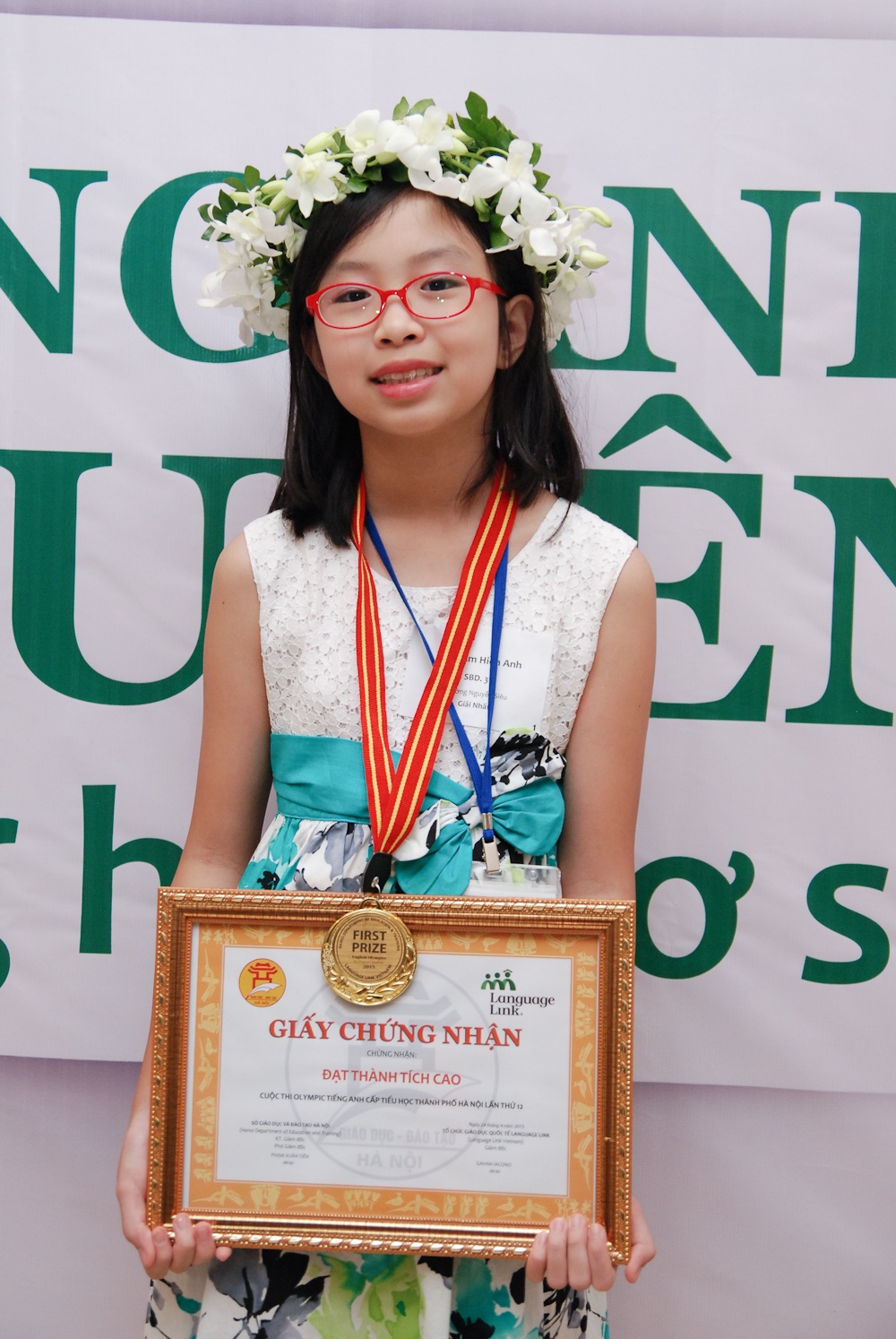 | Niềm vui sướng khi nhận giải nhất cuộc thi Olympic tiếng Anh tiểu học của Hiền Anh. |