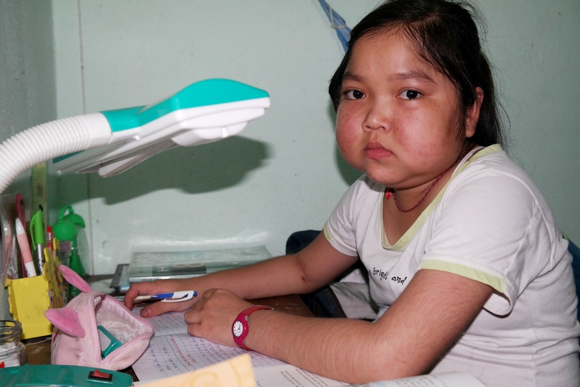 Trong căn nhà đơn sơ ở xóm nghèo Tân Phong, Hoa vẫn miệt mài học bài. Hai má của bé phình to do bệnh.