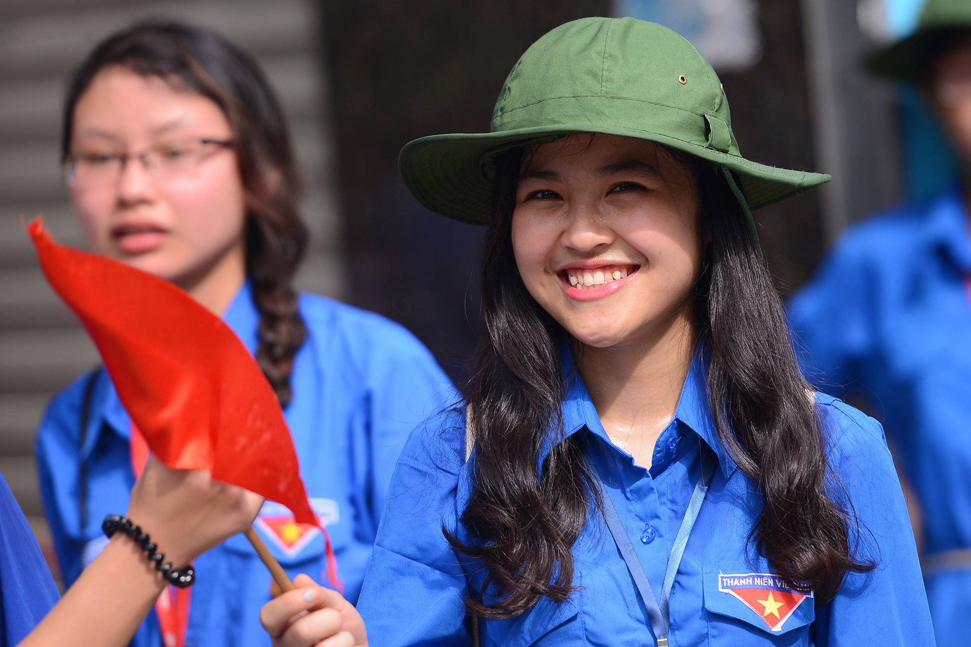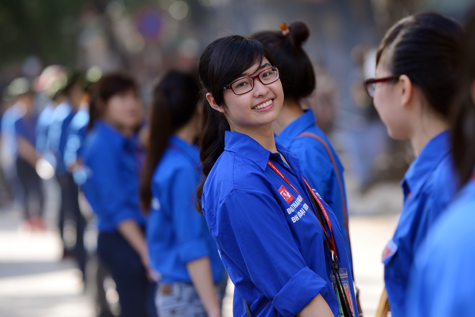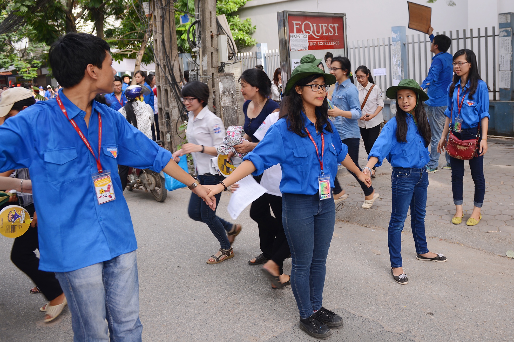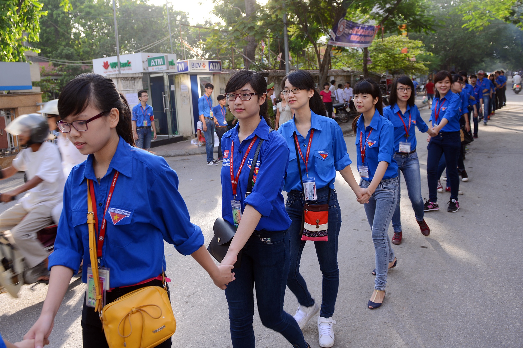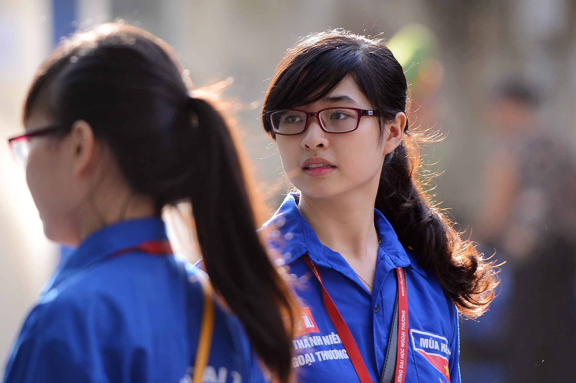| Trong ngày thi đầu tiên của kỳ thi Đại học 2014 tại trường Ngoại thương, ít ai để ý thấy một cô bé nhỏ nhắn, nhanh nhẹn hoạt bát trong bộ trang phục thanh niên tình nguyện nắm tay các anh chị sinh viên phân luồng giao thông giúp các thí sinh và phụ huynh qua đường an toàn. |