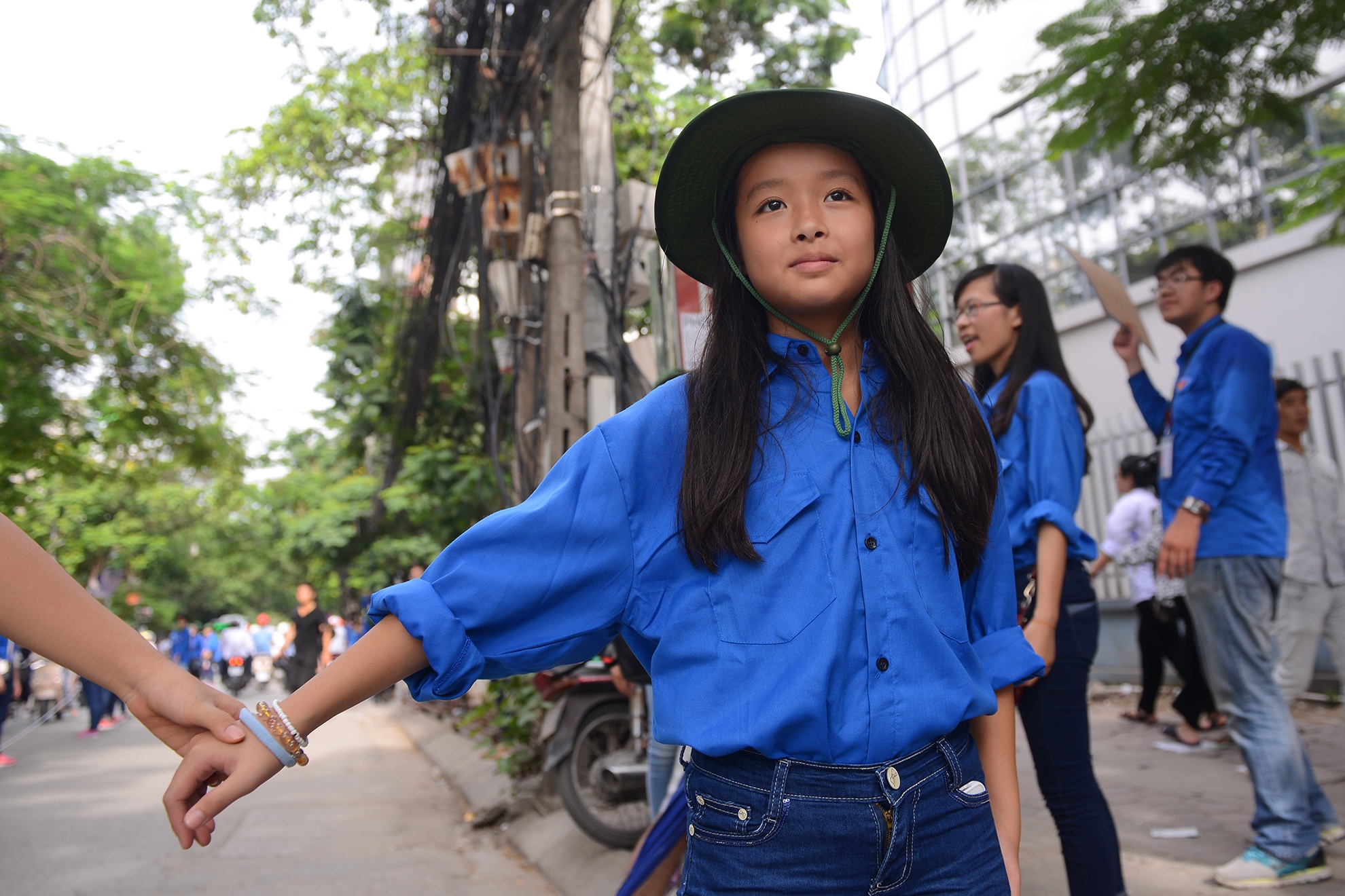 | Xinh xắn trong đồng phụ xanh tình nguyện và mũ tai bèo, các bạn luôn giữ vững đội hình dù nắng hay mưa. |