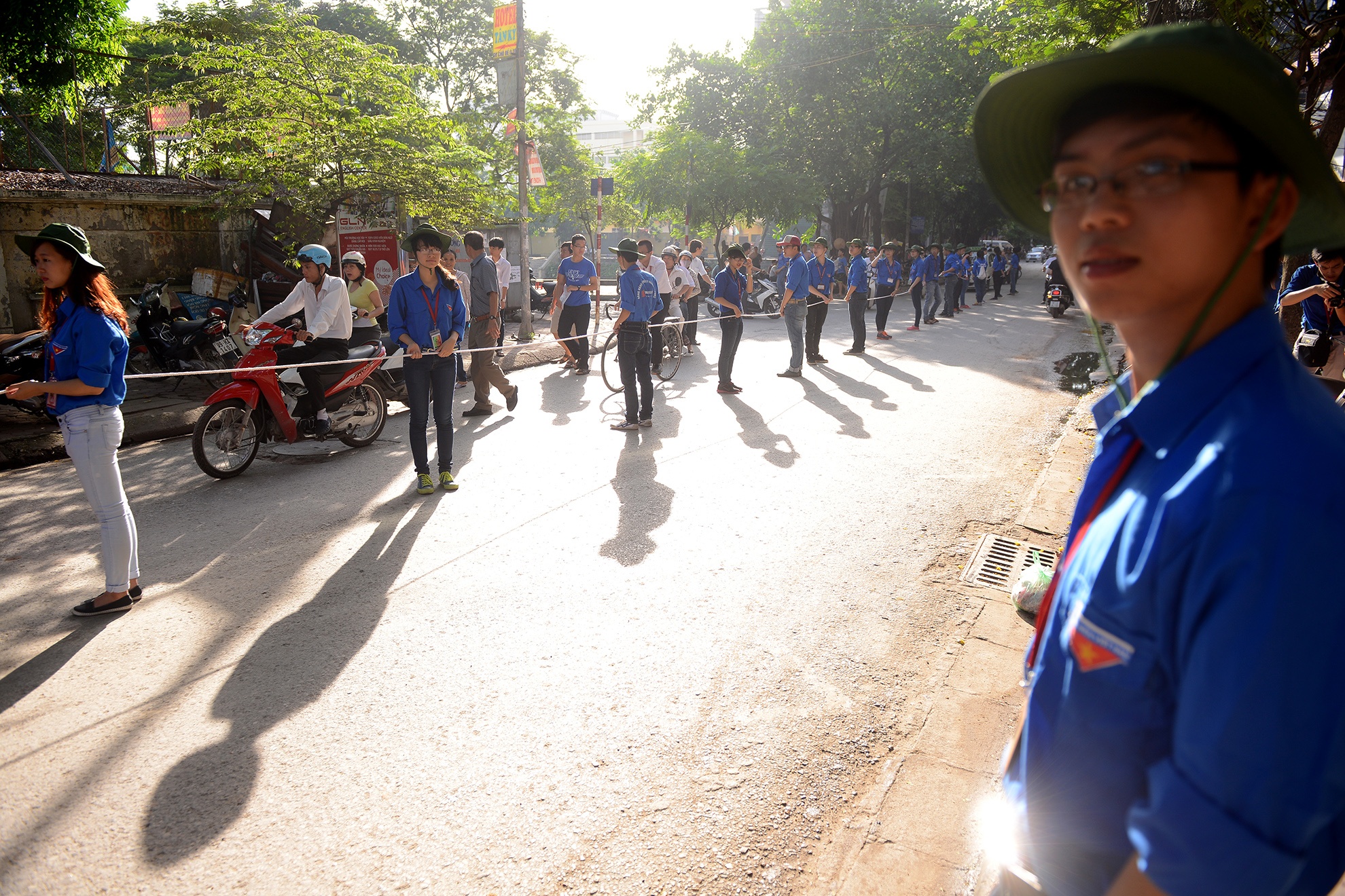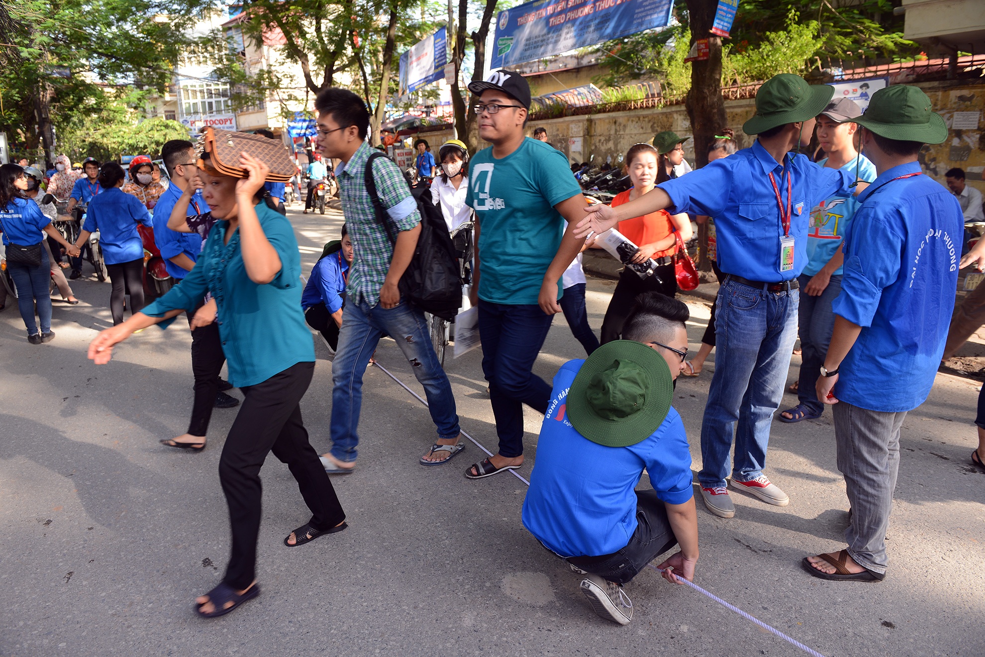 | Bên ngoài trường, "hàng rào xanh" luôn túc trực sẵn sàng đưa phụ huynh và thí sinh qua đường một cách an toàn cũng như chuẩn bị đồ ăn nhẹ, nước uống, quạt, kết quả thi cho thí sinh và học sinh, tất cả đều miễn phí. |