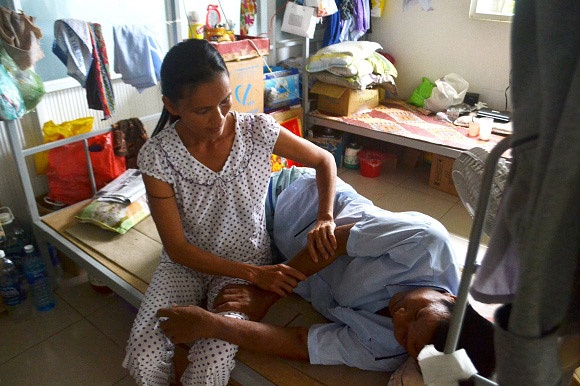 | Ba mẹ Thảo phải ở lại bệnh viện thường xuyên để tiện theo dõi. Gương mặt cô chú lộ rõ sự khắc khổ, nghèo khó. |