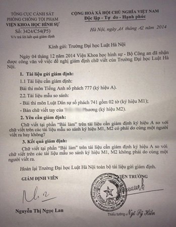 Đến đầu tháng 12, Trường ĐH Luật Hà Nội quyết định gửi công văn tới Viện Khoa học hình sự, Tổng cục Cảnh sát phòng chống tội phạm đề nghị giám định chữ viết với tài liệu cần giám định là bài thi môn tiếng Anh (ký hiệu A) của thí sinh T.T.P. và bài thi môn Luật dân sự cùng bản chữ viết tay của P.