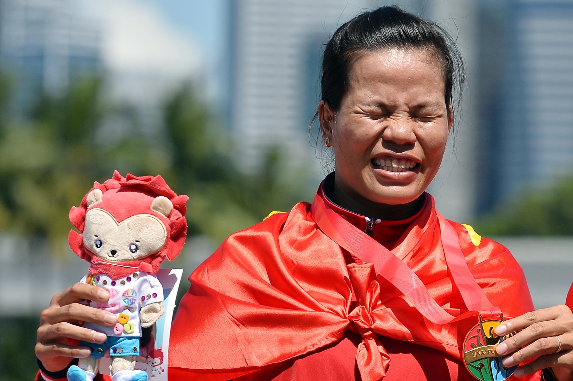| VĐV Phạm Thị Huệ liên tục nheo mắt vì chói nắng. |