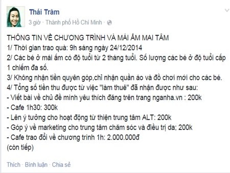 | Status mới đây của Thái Trâm công khai số tiền kiếm được và thông tin của chương trình. |