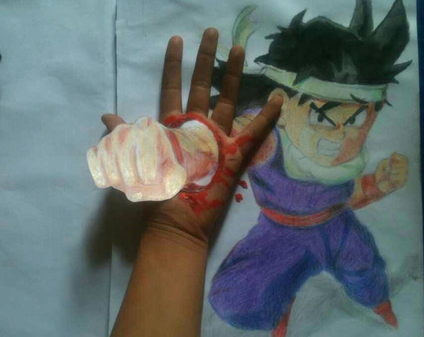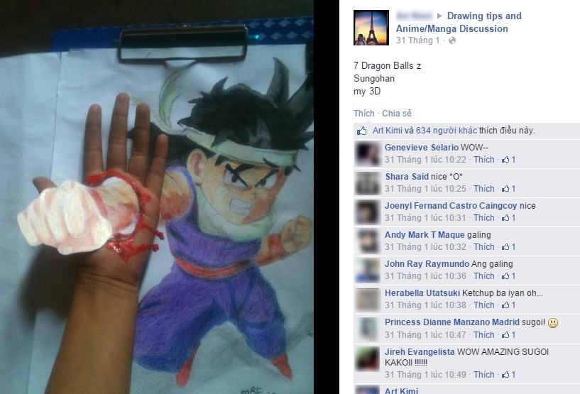 Mới đây trên diễn đàn diễn họa Việt, tài khoản có tên Art Kimi đã đăng tải một bức vẽ nhân vật Son Gohan - trong truyện tranh 7 Viên Ngọc Rồng, gây chú ý cộng đồng yêu vẽ. Trong hình, tác giả đã khéo léo đánh lừa thị giác mọi người bằng cách tạo hiệu ứng 3D xuyên tay độc đáo. Bức tranh này cũng được chia sẻ lên 1 diễn đàn hội họa ở nước ngoài, nhận được nhiều lời khen ngợi.