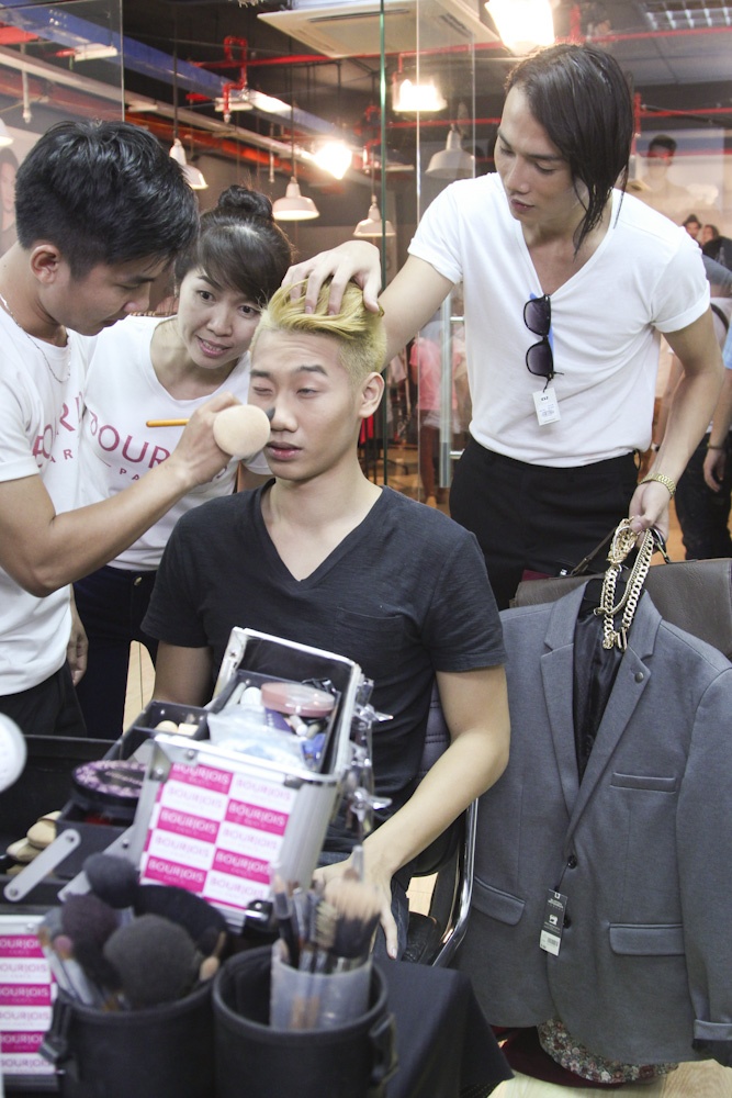 | Trong khi đó, cặp đôi Tạ Quang Hùng và Công Toàn thể hiện tinh thần hợp tác ăn ý. "Nàng thơ" của Đỗ Mạnh Cường nhiệt tình tư vấn, trợ giúp bạn đồng hành ướm trang phục. |