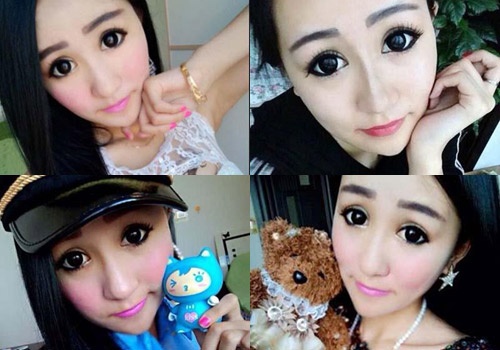 | Khá nhiều bức ảnh của cô gái có chiếc cằm nhọn, khuôn mặt luôn được trang điểm đậm, với đôi mắt đeo len, má hồng quá mức được đăng tải trên mạng khiến người xem phát hoảng và có nhiều lời phê phán. |